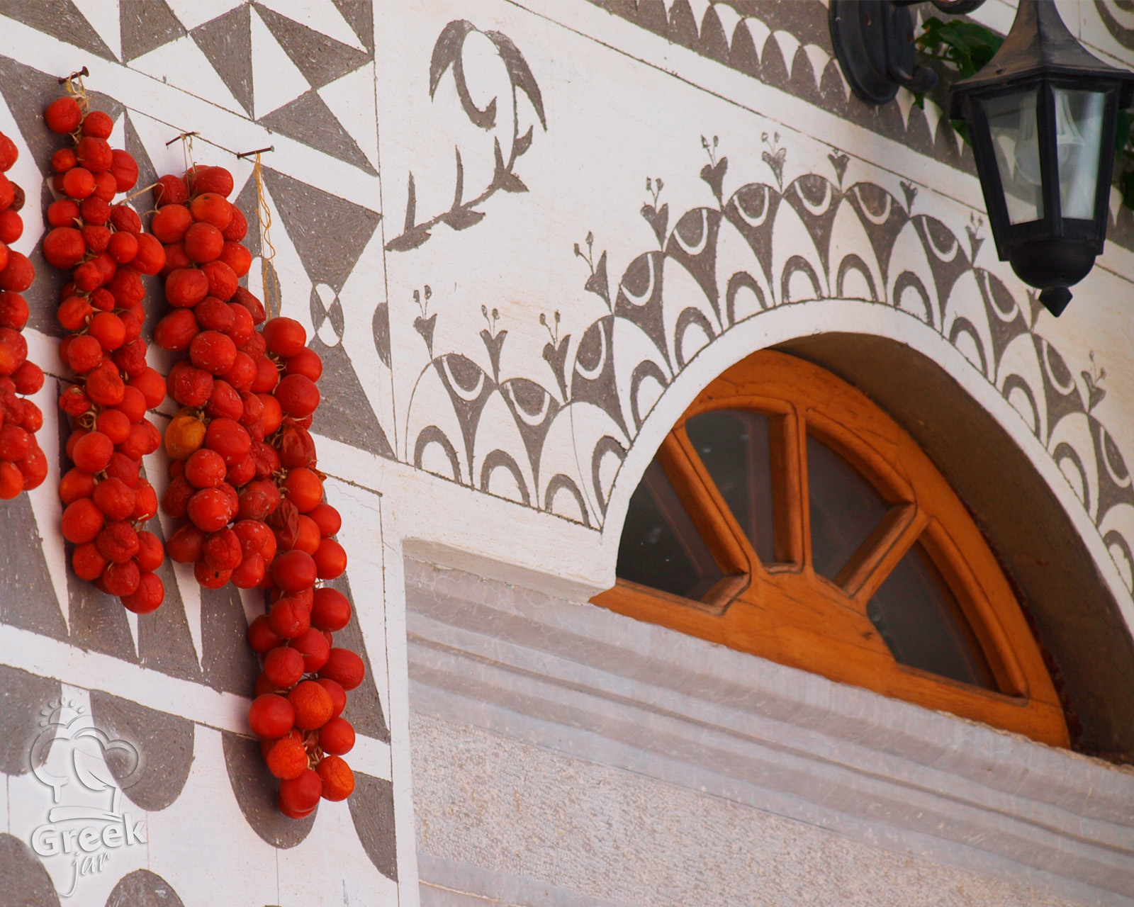 On the island of Chios, summer never fades… Tiny sun-drenched tomatoes, full of flavor, are threaded one by one with a string, forming the characteristic restes—red rows that hang like ornaments in courtyards, storerooms, and balconies.