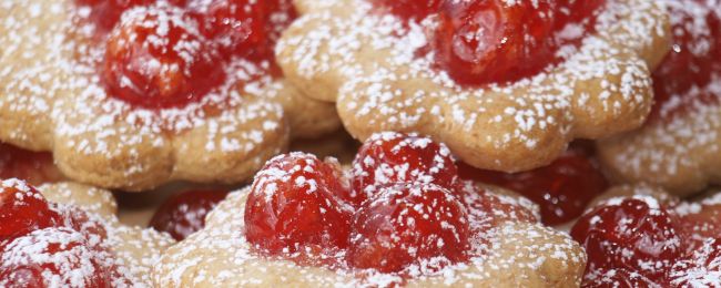 - Roll out the dough to a thickness of 0.6 - 0.7 cm and cut with a cookie cutter. Transfer to a baking tray lined with parchment paper and add 3 - 4 cherries on top of each cookie.