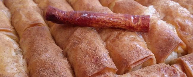 - Προσθέτουμε σε κάθε λωρίδα μία μεγάλη κουταλιά από κρέμα, διπλώνουμε στα πλάγια και τυλίγουμε σε ρολό. Επαναλαμβάνουμε τη διαδικασία και με τα υπόλοιπα φύλλα.