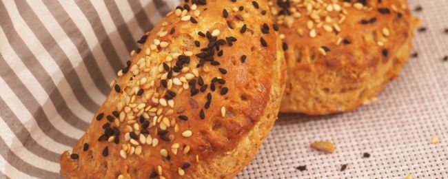 - Αλείφουμε με γάλα, πασπαλίζουμε με λευκό και μαύρο σουσάμι και ψήνουμε σε προθερμασμένο φούρνο (στον αέρα) στους 180 oC - 355 oF για περίπου 20΄- 25΄ λεπτά.