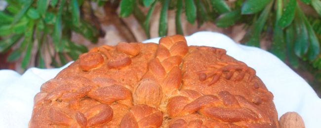 Πλάθουμε το ψωμί μας σε καρβέλι, το διακοσμούμε με τα σχέδια της προτίμησής μας και το μεταφέρουμε σε βουτυρωμένο και αλευρωμένο στρογγυλό ταψί (διαμέτρου 30 εκ.).